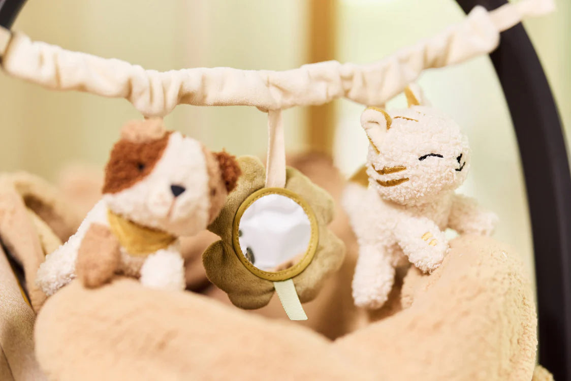 Questo adorabile giocattolo per passeggino Tiny Park è perfetto per intrattenere il bambino durante le passeggiate. Contiene un cucciolo, un gattino e un quadrifoglio con un mini specchietto integrato. Le piccole campanelle emettono un suono rilassante – un giocattolo ideale da portare ovunque!