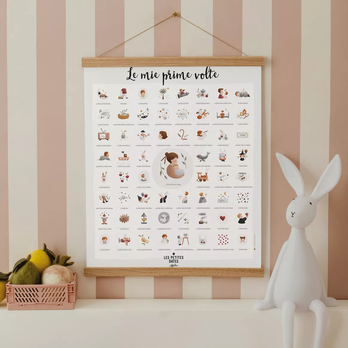Tutte le date da ricordare dei primi anni del bambino su un poster: la prima volta che dico "mamma", La prima notte completa, la prima bua... 61 prime volte da datare per ricordare sempre i momenti più belli.