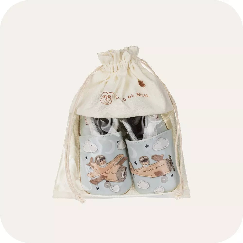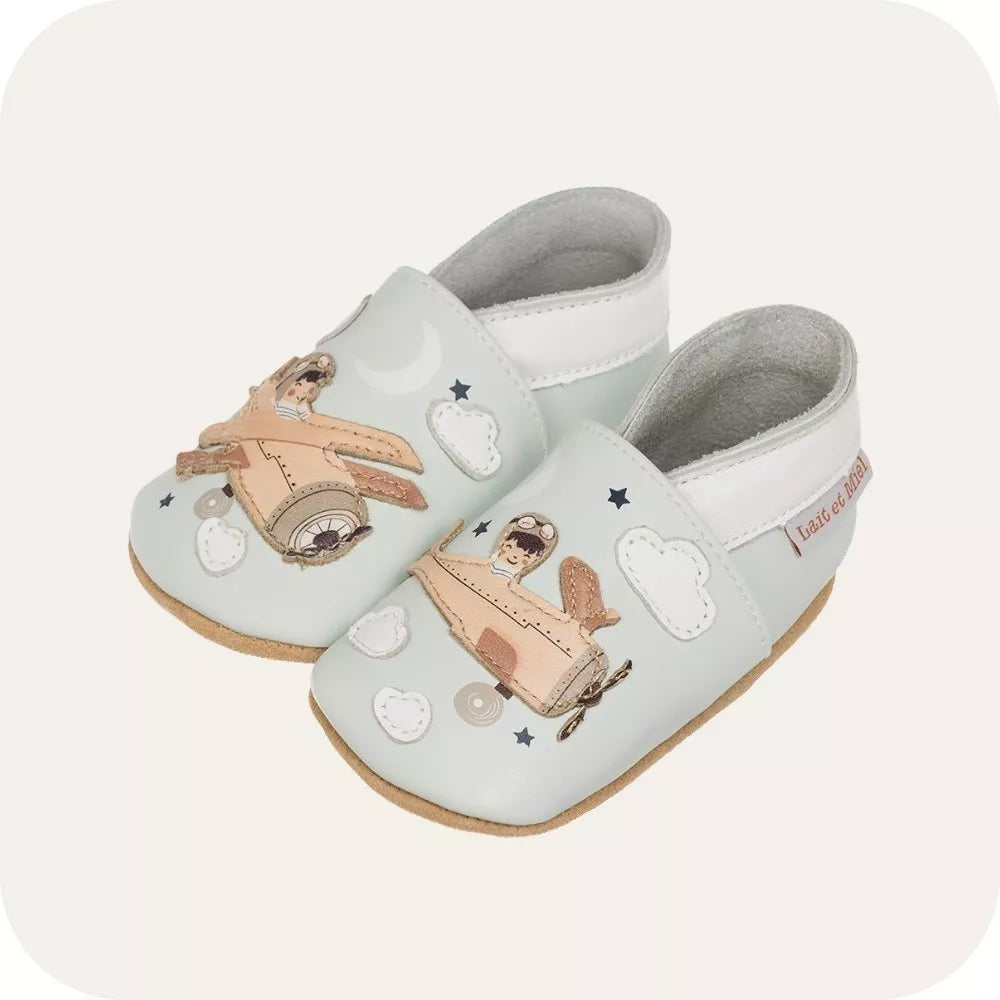 Dans notre collection « voyages d’antan », voici un petit aviateur tout heureux de faire de la haute-voltige dans le ciel ! La tige est en cuir et la semelle en suède (cuir retourné).